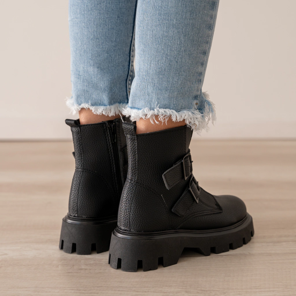 Descubre la Bota Flor confeccionada en cuero sintético negro, un calzado que no solo es elegante, sino también práctico. Con hebillas en la capellada, estas botas aportan un toque distintivo a tu look, haciéndolas ideales para cualquier ocasión.